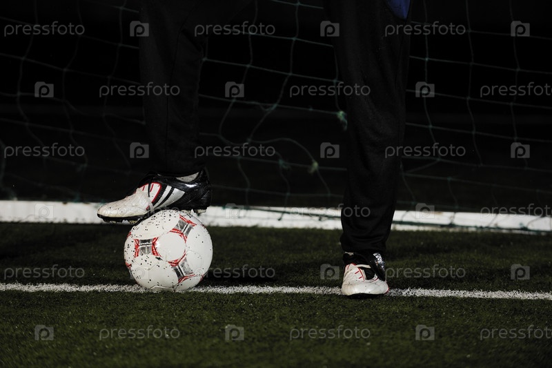 Нога голкипера на мяче дождливой ночью на футбольном поле