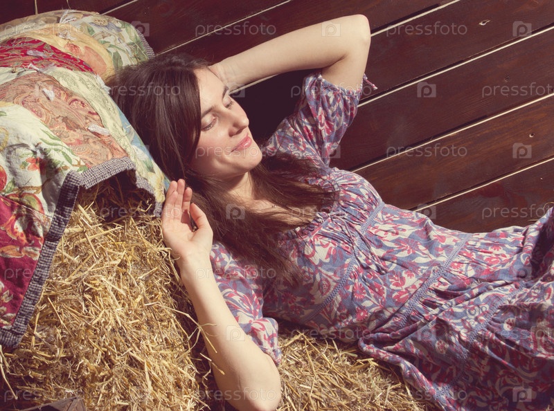 Портрет красивой девушки в платье на стоге сена