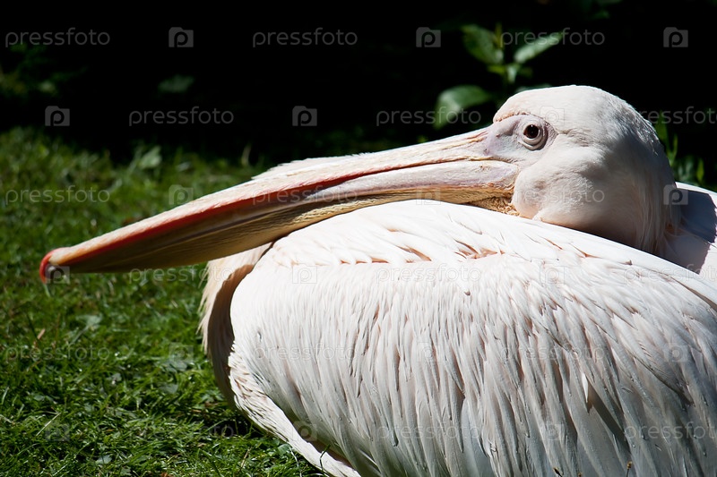 Красноклювый пеликан на траве в зоопарке