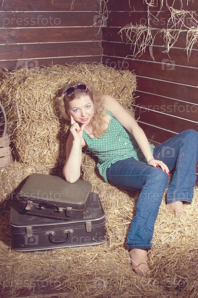 Девушка с багажом в сарае с соломой