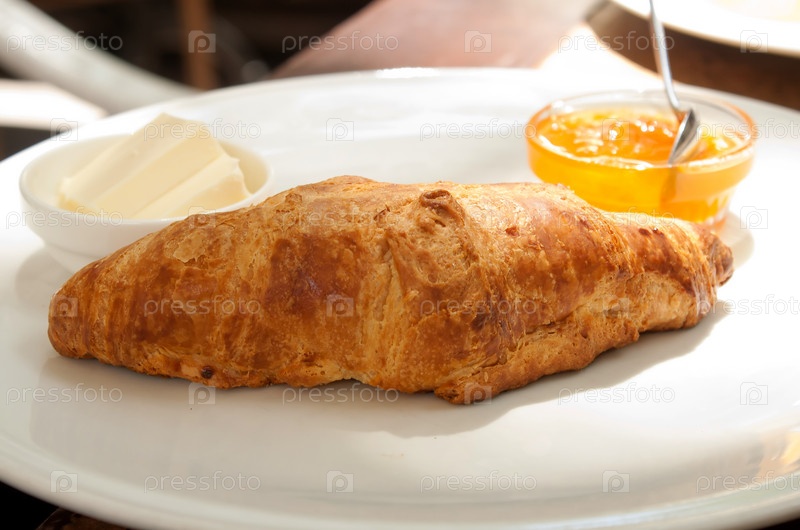 Круассан на тарелке с джемом крупным планом