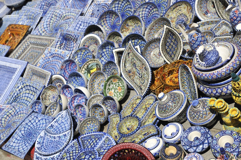 Красочные керамические сувениры на уличном рынке в Тунисе, Африка