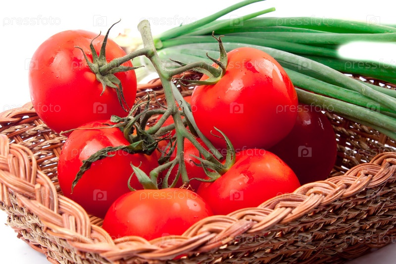 Красные помидоры в корзине на белом фоне
