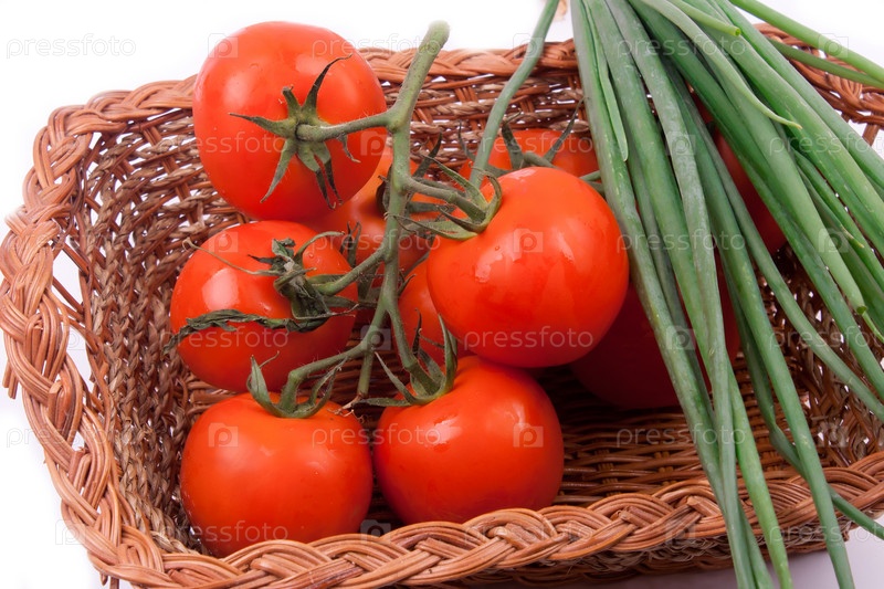 Красные помидоры в корзине на белом фоне