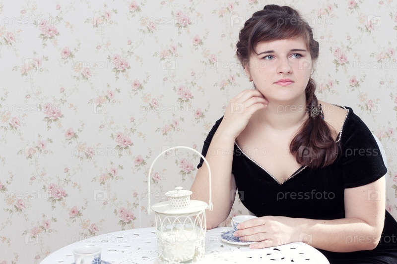 Портрет молодой задумчивой женщины за столом с чашкой кофе