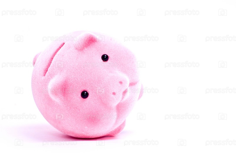 Маленькая розовая свинья с деньгами, изолированными на белом