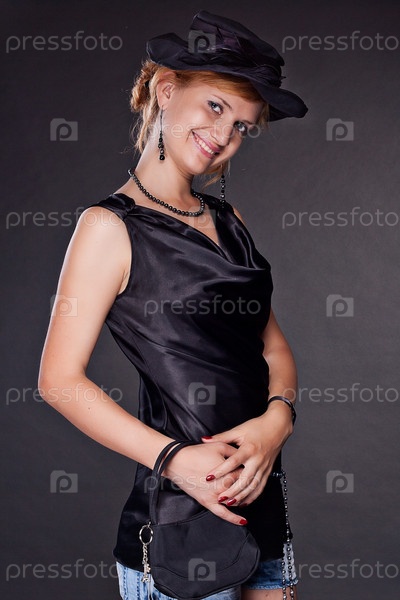 Рыжеволосая девушка в черной одежде и шляпе на черном фоне