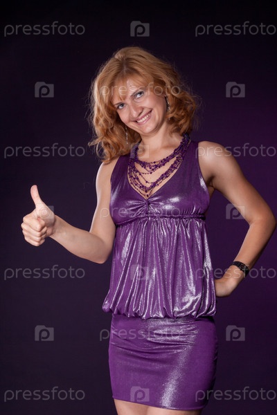 Успешная девушка в сиреневом платье на темном фоне