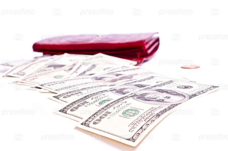 Долларные купюры и красный кошелек изолированы на белом