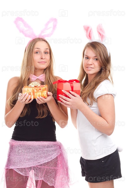 Две девушки с кроличьими ушками на голове и с подарками в руках