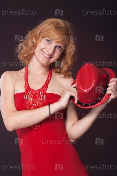 Рыжеволосая девочка в красном платье и с красной шляпой в руках. Студия фотографии