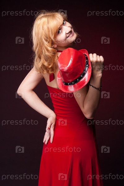 Рыжеволосая девочка в красном платье и с красной шляпой в руке. Студия фотографии