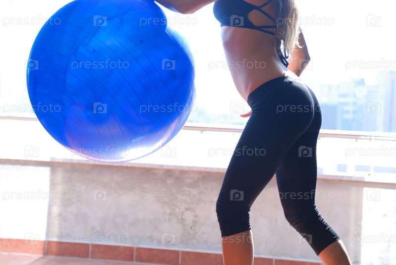 Женщина делает упражнения с голубым мячом для пилатеса