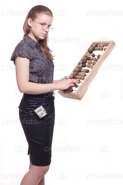 Девушка считает на больших деревянных счетах на белом фоне
