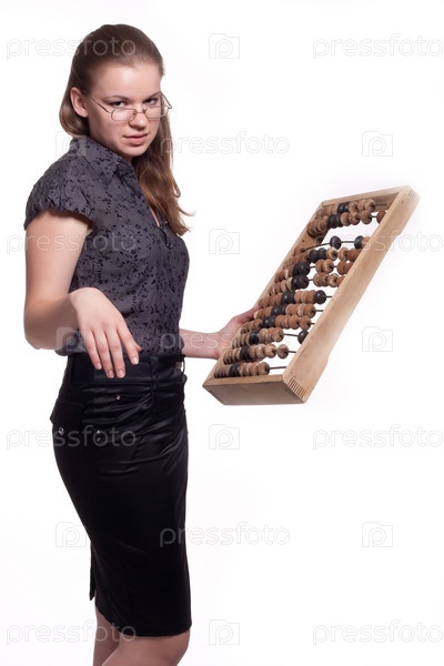 Девушка с большими деревянными счетами в руке на белом фоне