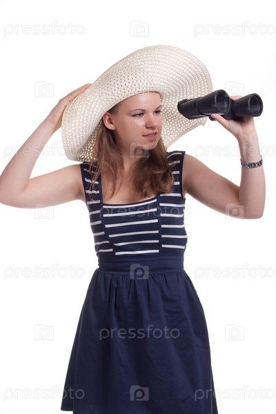 Девушка в соломенной шляпе смотрит в бинокль