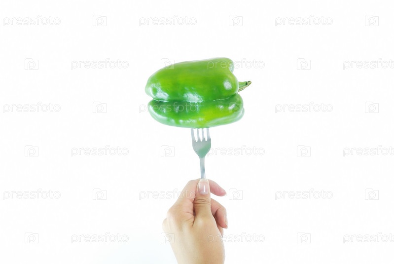 Зеленый перец на вилке, изолированный на белом фоне