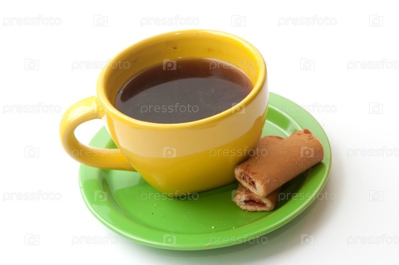 Желтая чашка кофе с печеньем на белом фоне