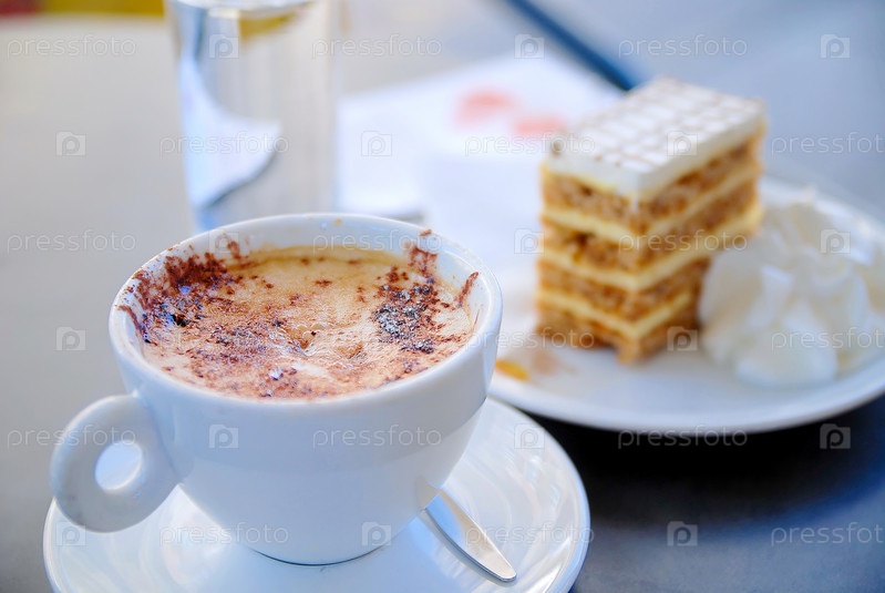 Чашечка каппучино и пирожное на столе