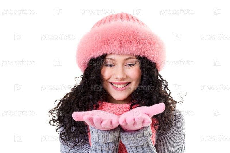 Веселая женщина в розовой зимней медовой шляпе смотрит на ладони с улыбкой
