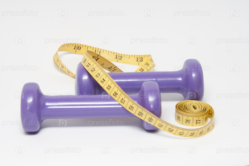 Фиолетовые гантели и желтый портняжный сантиметр на белом фоне