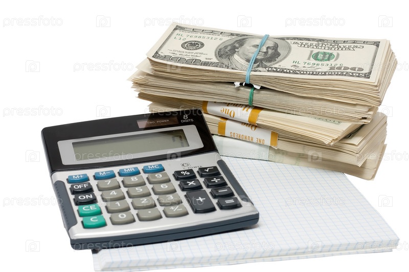 Пачки денег и калькулятор на белом фоне