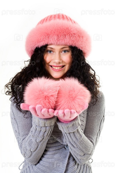Портрет веселой женщины в розовой зимней шерстяной шляпе, глядящей с улыбкой
