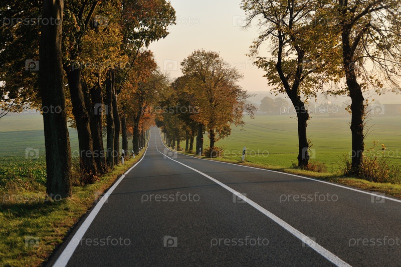 Сельская дорога на рассвете, окруженная ярко-оранжевыми деревьями