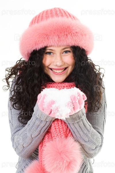 Портрет веселой женщины в розовой зимней шерстяной шляпе, держащей снег в руках