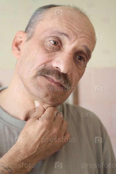 Старый лысый мужчина выглядит грустно и касается их кожи