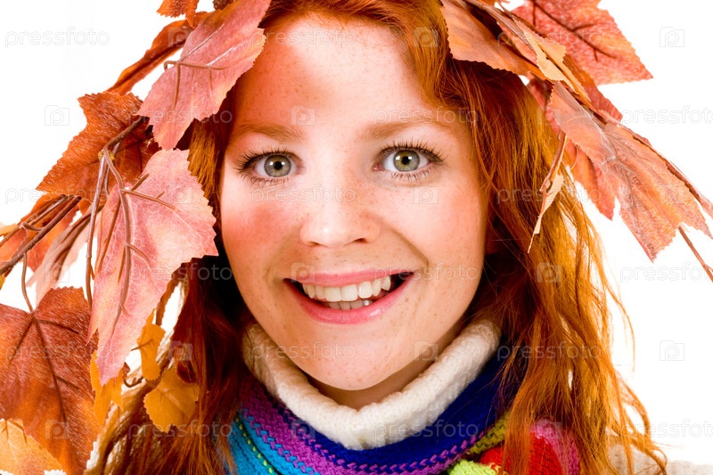 Портрет улыбающейся молодой женщины с венком из кленовых листьев