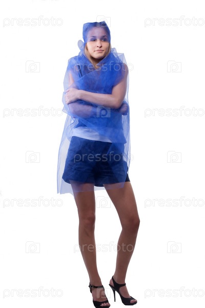 Красивая девушка в накидке из голубого тюля