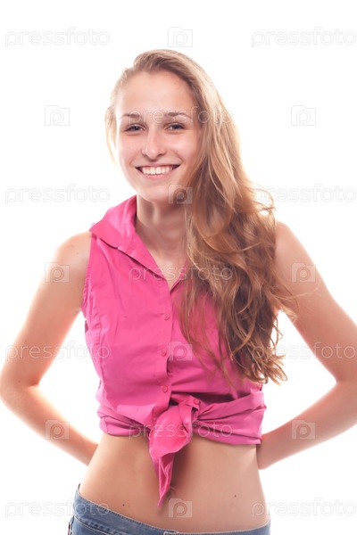 Красивая девушка в розовой рубашке на белом фоне