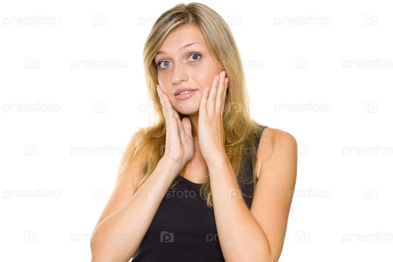 Портрет удивленной молодой женщины на белом фоне