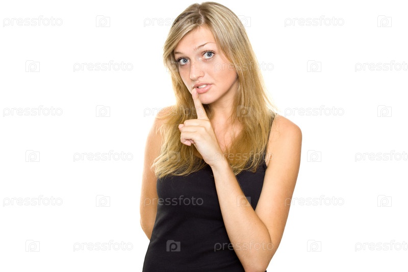 Девушка делает знак замолчать на белом фоне