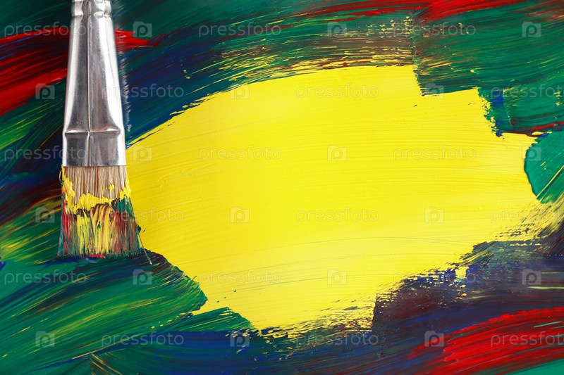Концепция живописи. Фон абстрактной живописи с кистью и большим желтым пятном для текста