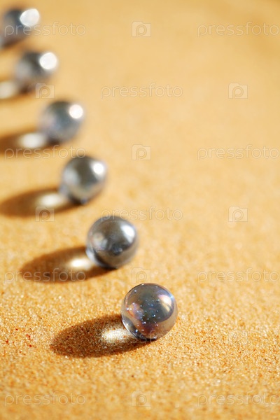 Ряд стеклянных шариков на песчаной поверхности