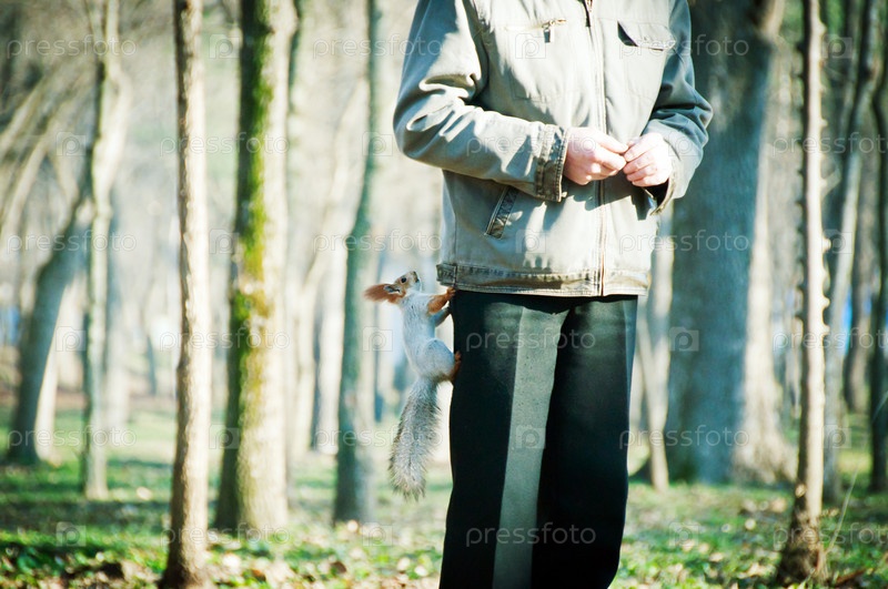 Белка залезает на человека в парке