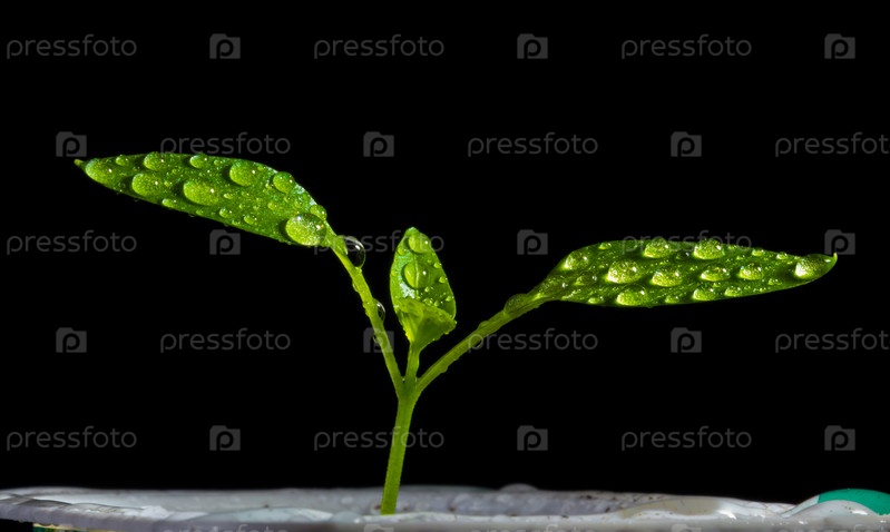 Молодой побег томатов с каплями воды на черном фоне