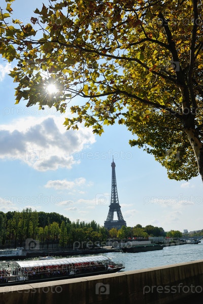 Эйфелева башня в Париже, известная туристическая достопримечательность, днем на фоне живописного неба