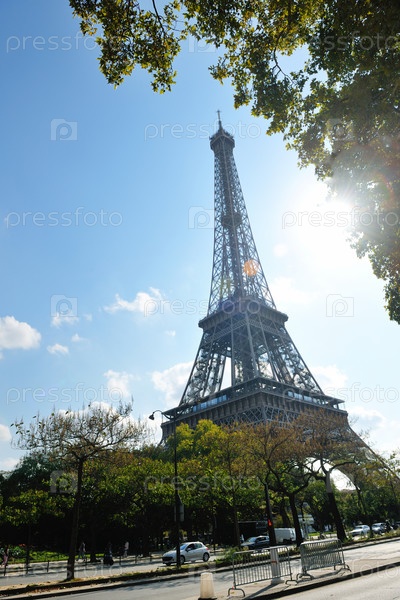 Эйфелева башня в Париже, известная туристическая достопримечательность, днем на фоне живописного неба