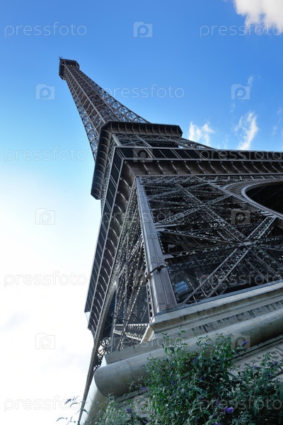Эйфелева башня в Париже, известная туристическая достопримечательность, днем на фоне живописного неба