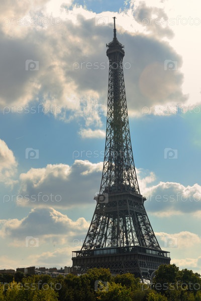 Эйфелева башня в Париже, известная туристическая достопримечательность, днем на фоне живописного неба