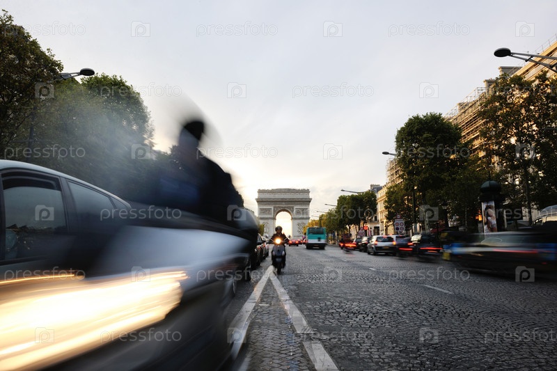 Красивый вечерний вид на Триумфальную арку с движущимися автомобилями. Париж, Франция