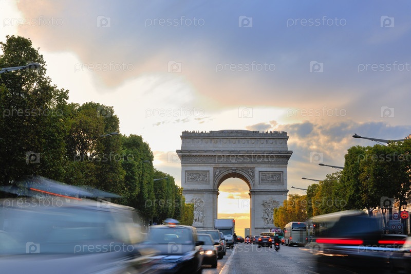 Красивый вечерний вид на Триумфальную арку с движущимися автомобилями. Париж, Франция