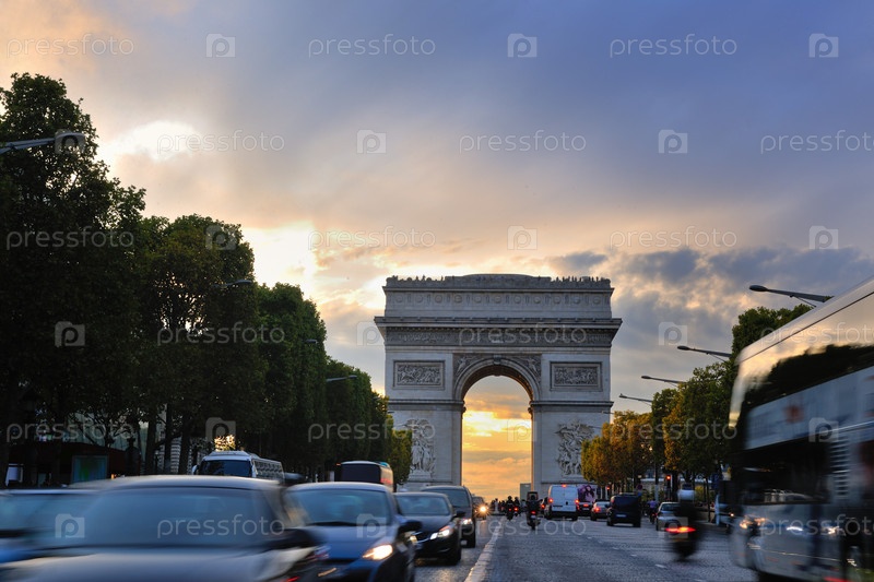 Красивый вечерний вид на Триумфальную арку с движущимися автомобилями. Париж, Франция