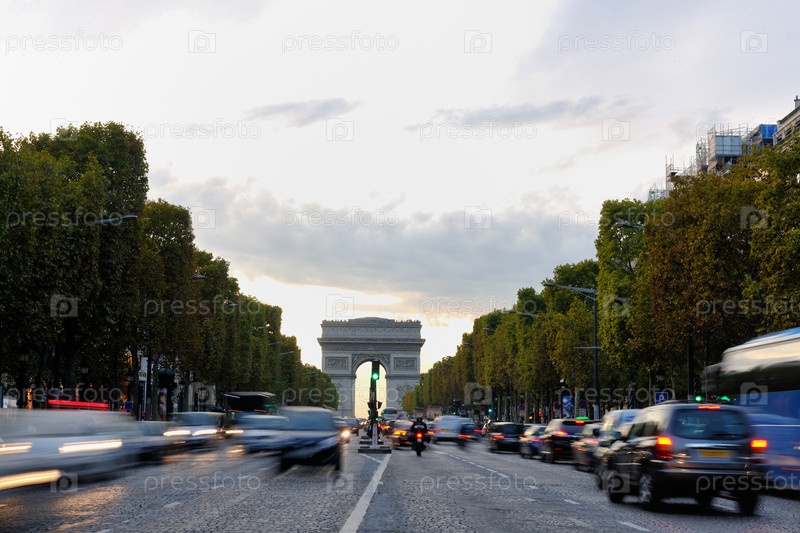 Красивый вечерний вид на Триумфальную арку с движущимися автомобилями. Париж, Франция