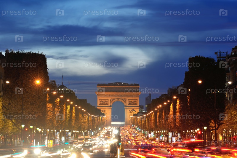 Красивый ночной вид на Триумфальную арку с движущимися автомобилями. Париж, Франция