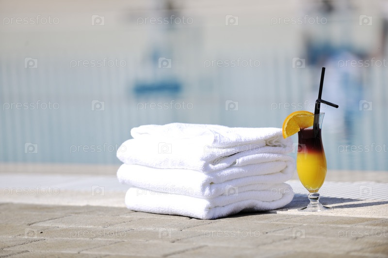 Коктейль с апельсином и белые полотенца на кромке бассейна в солнечный день