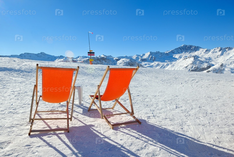 Отдых. Шезлонги на вершине горного хребта на фоне ясного неба в зимний солнечный день